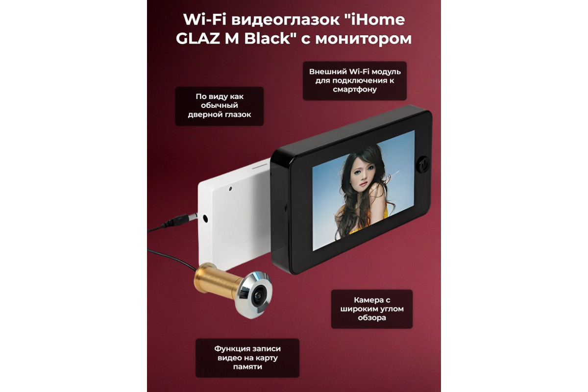 Wi-Fi видеоглазок "iHome GLAZ М Black" с монитором и удаленным доступом через интернет, запись по движению